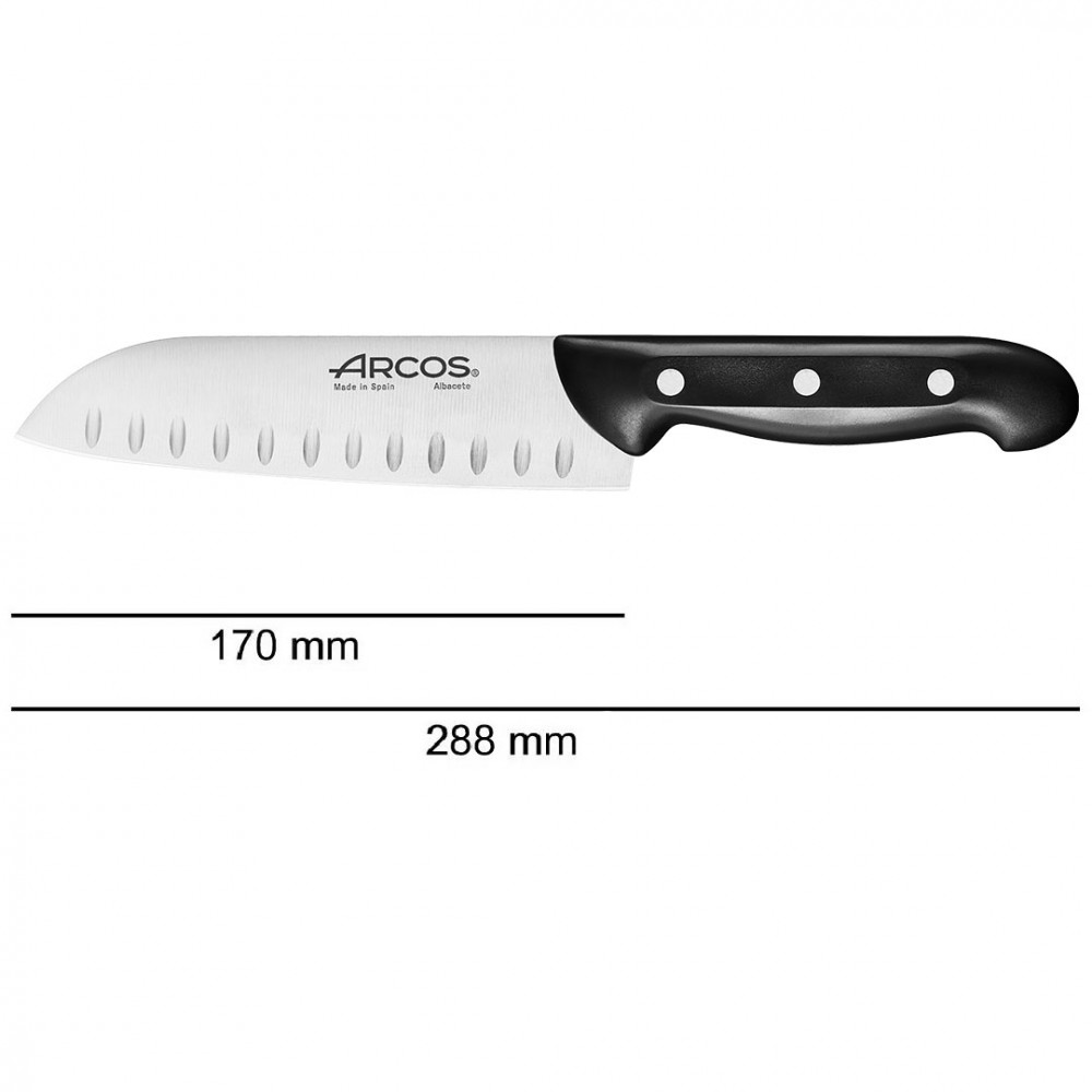 Ніж Сантоку – винятковий шеф-ніж, що поєднав у собі західну та японську культури. «Сантоку» в перекладі – «три хороші речі», що говорить про придатність ножа добре рубати, кришити та нарізати дрібними скибками або кубиками як м'ясо, так і овочі. Підходить для підготовки м’ясного та рибного фаршу при створенні соковитих рубаних котлет, для тонкого нарізання слайсів м'яса, риби та овочів та т.п. Серія кухонних ножів «Майтре» Аркос ідеальна для невеликих кухонь та підходить для побутового використання.