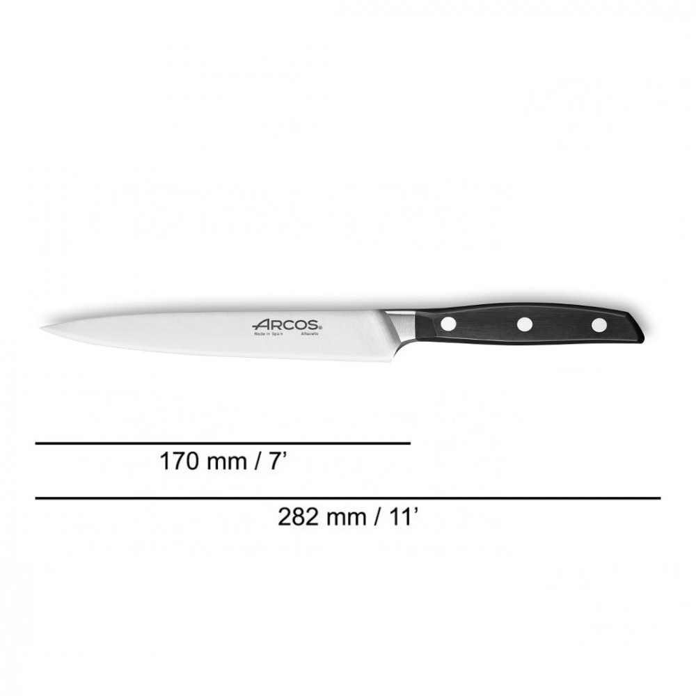 - Твердість леза і міцність краю ножів Arcos перевищують середні по галузі значення. Тривала гострота ножа і його зносостійкість забезпечується через твердість сталі, тому потреба в заточенні виникає рідше.
