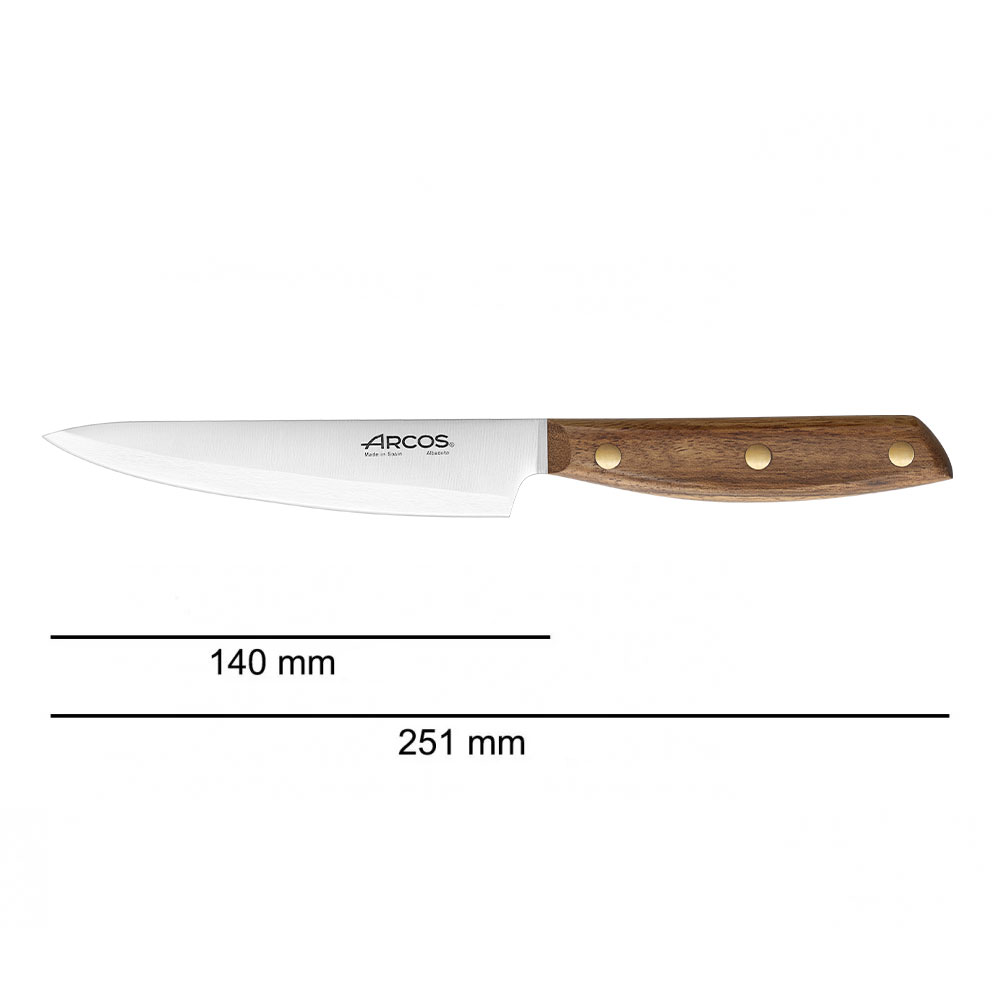 Ножі Arcos серії Nordika виготовлені з прокатної сталі Nitrum методом штампування. Склад сталі наближений до кованих ножів. Прокатні ножі – тонкі, легкі, невибагливі, стійкі до вологи. Такі ножі легко правити та точити.