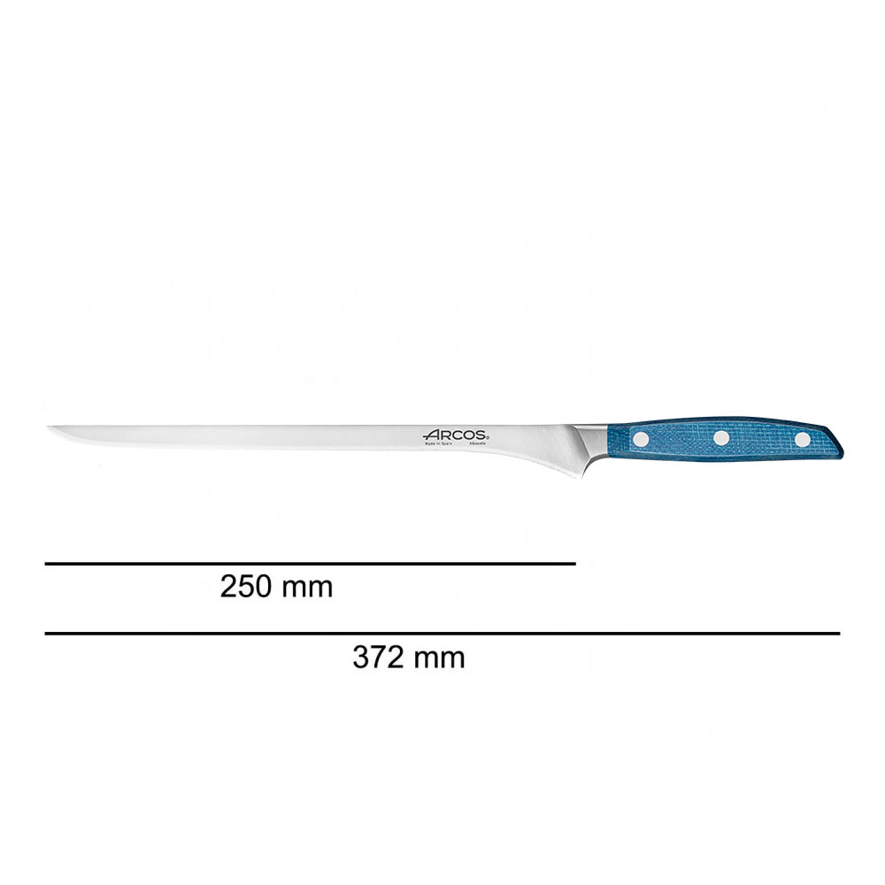 Нож для хамона 250 мм серии «Бруклин» Аркос с голубой рукояткой предназначен для аккуратного срезания тонких ломтиков мяса благодаря длинному и гибкому лезвию ножа.